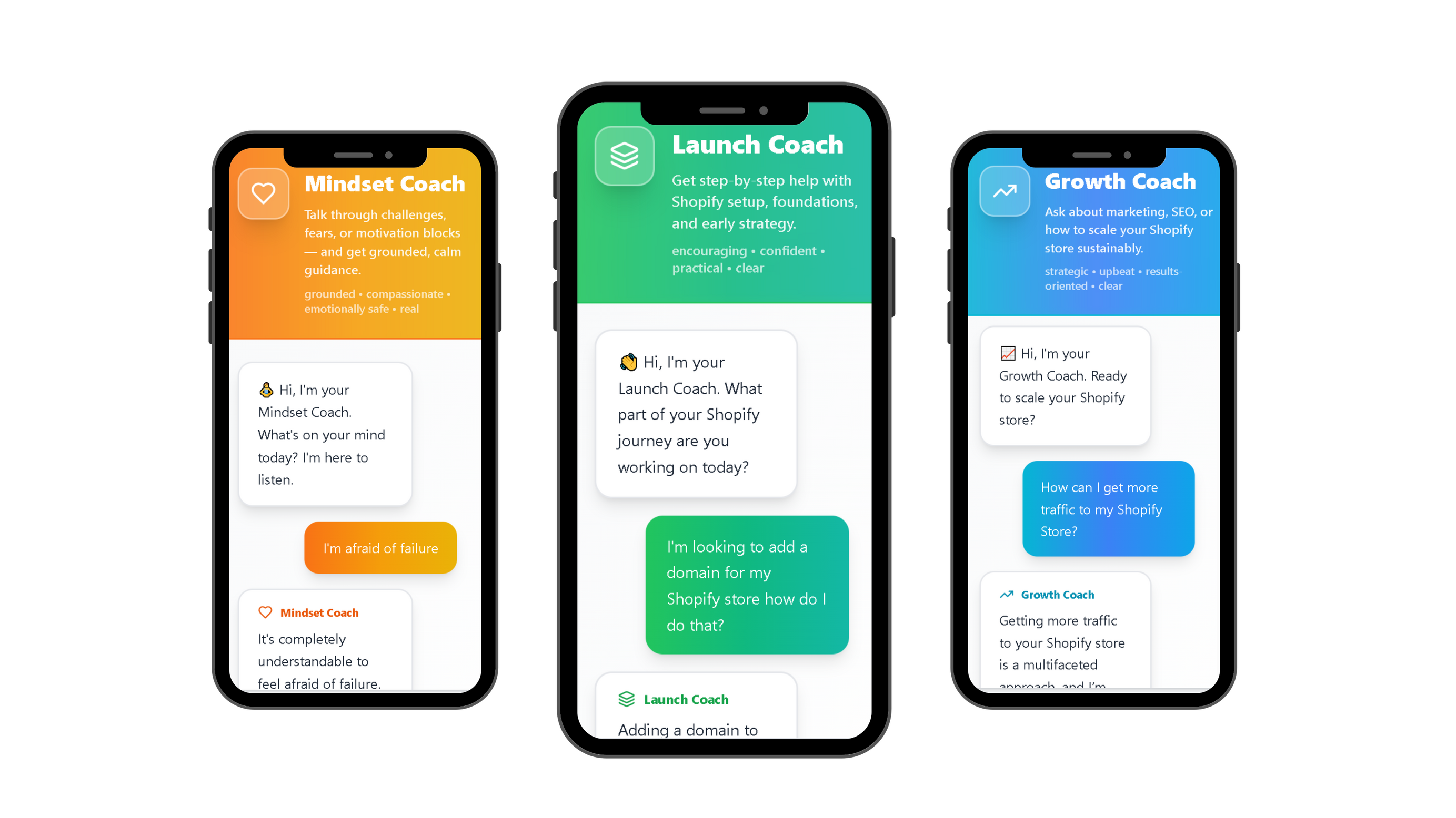 This is the heart of Launch Strong.You get five specialised AI coaches — each with their own personality, style, and role — working together to guide you through every stage of launching and growing your store.They even handoff tasks to each other.