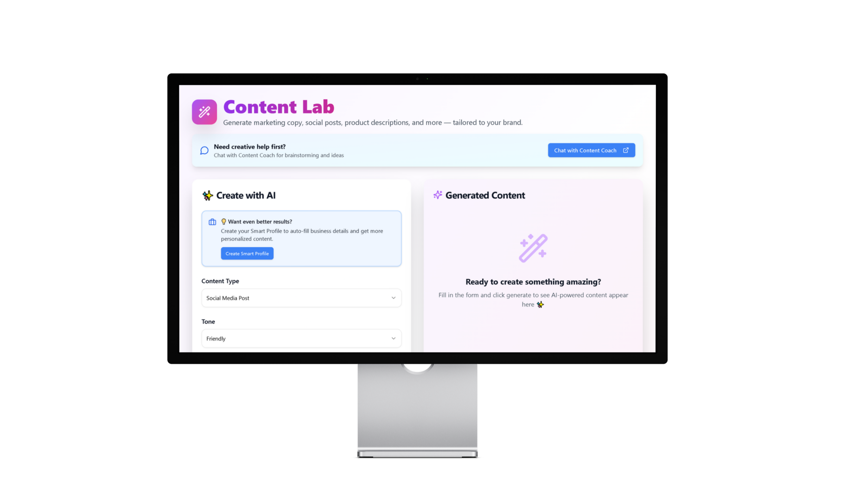 Within seconds you will be given a full 30 days of content ideas all fully tailored to your brand thanks to Smart Profile™From there you can then send your content calendar or individual pieces of content straight to Content Coach for further support.