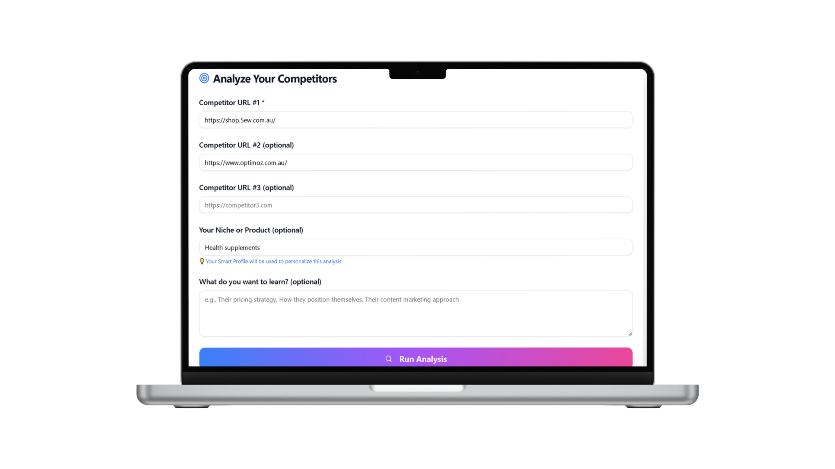 SmartProfile™ learns:- Your niche- Your audience- Your product- Your goals- Your challenges- Your brand personality