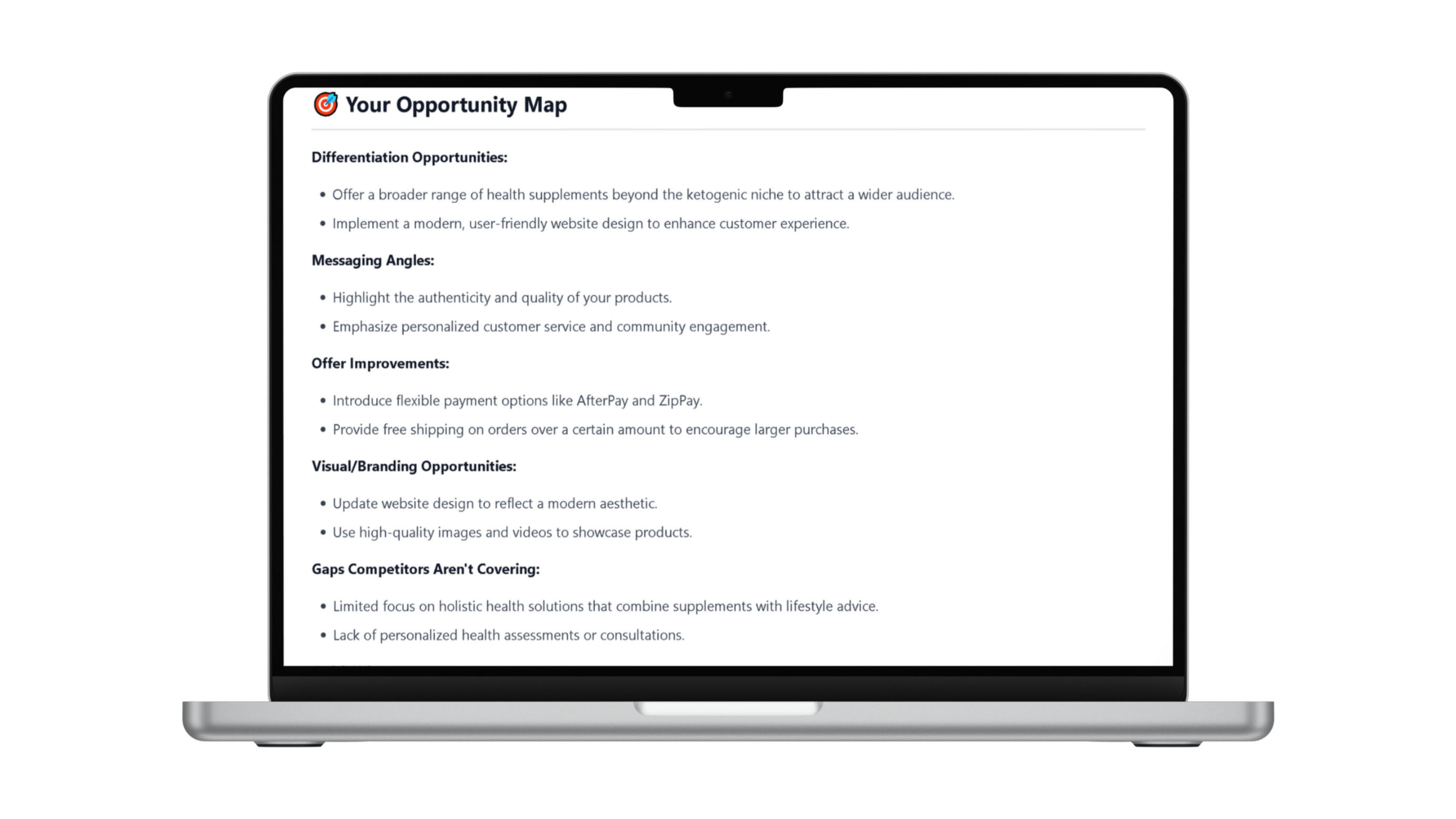 You get:✔ tailored marketing angles✔ niche-specific SEO✔ personalised recommendations✔ a unique launch path✔ product positioning✔ audience messaging✔ homepage advice✔ content ideasThis removes confusion instantly.