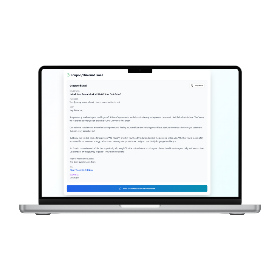 Once sent your Content Coach AI will work with you to refine it was much as you like. Generate variations and create more emails. Giving you the power to create emails easily and effortlessly.