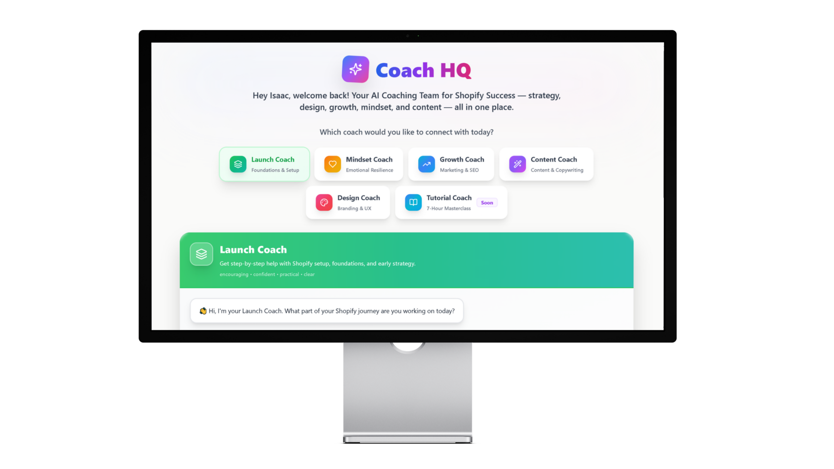 This is the heart of Launch Strong.You get five specialised AI coaches — each with their own personality, style, and role — working together to guide you through every stage of launching and growing your store.They even handoff tasks to each other.