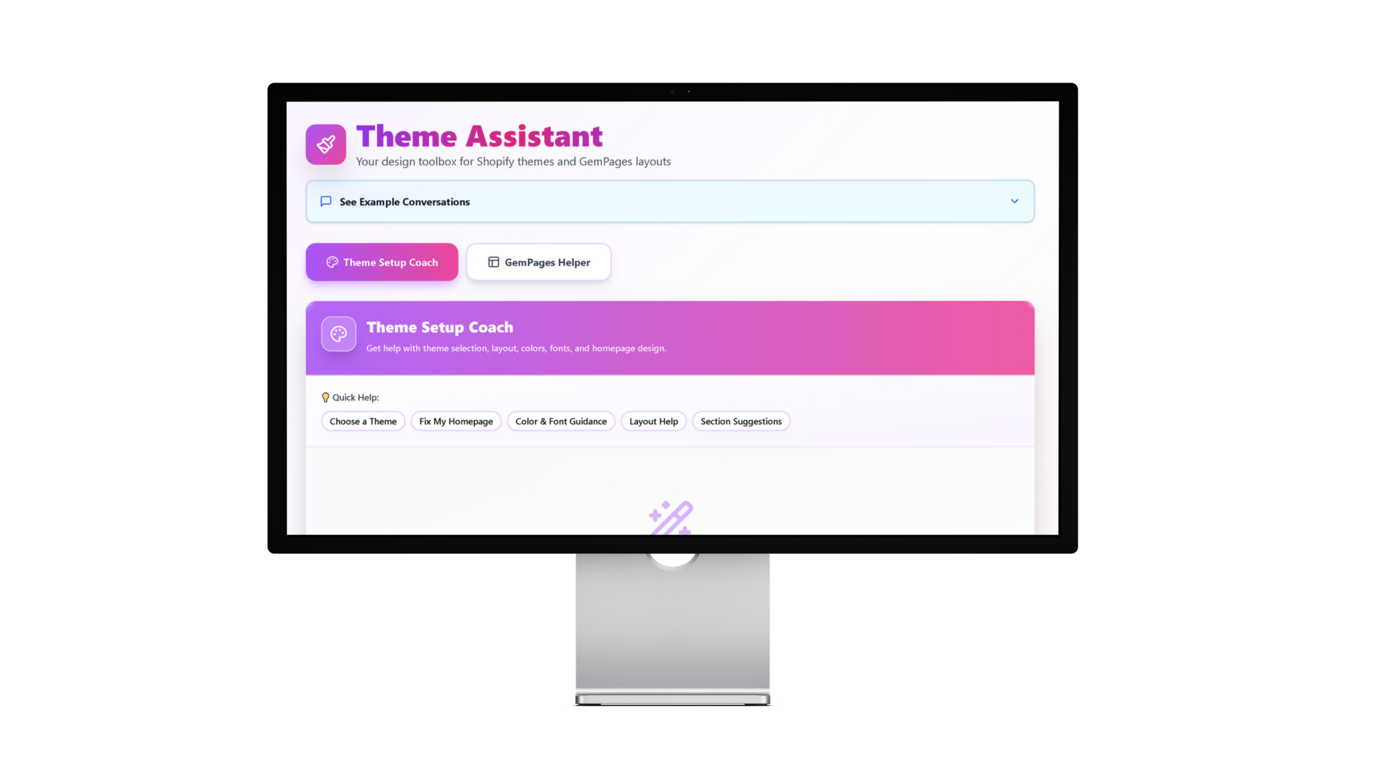 Design Coach helps you create a store that looks clean, trustworthy, and premium.It guides you with:- colour palettes- typography- imagery- homepage layout- product page structure- spacing & alignment- brand identity- navigation clarityIt’s like having a designer on call.