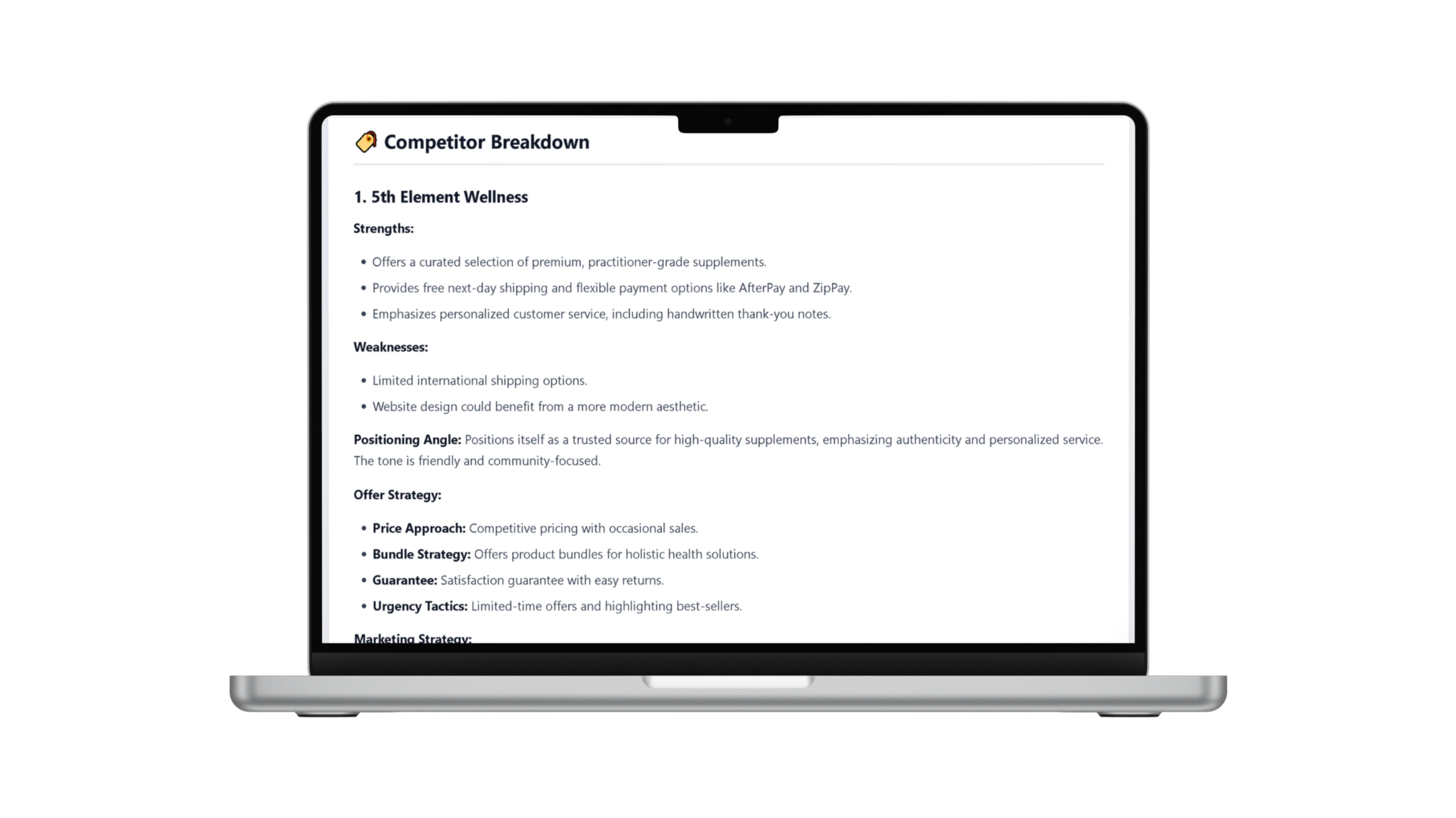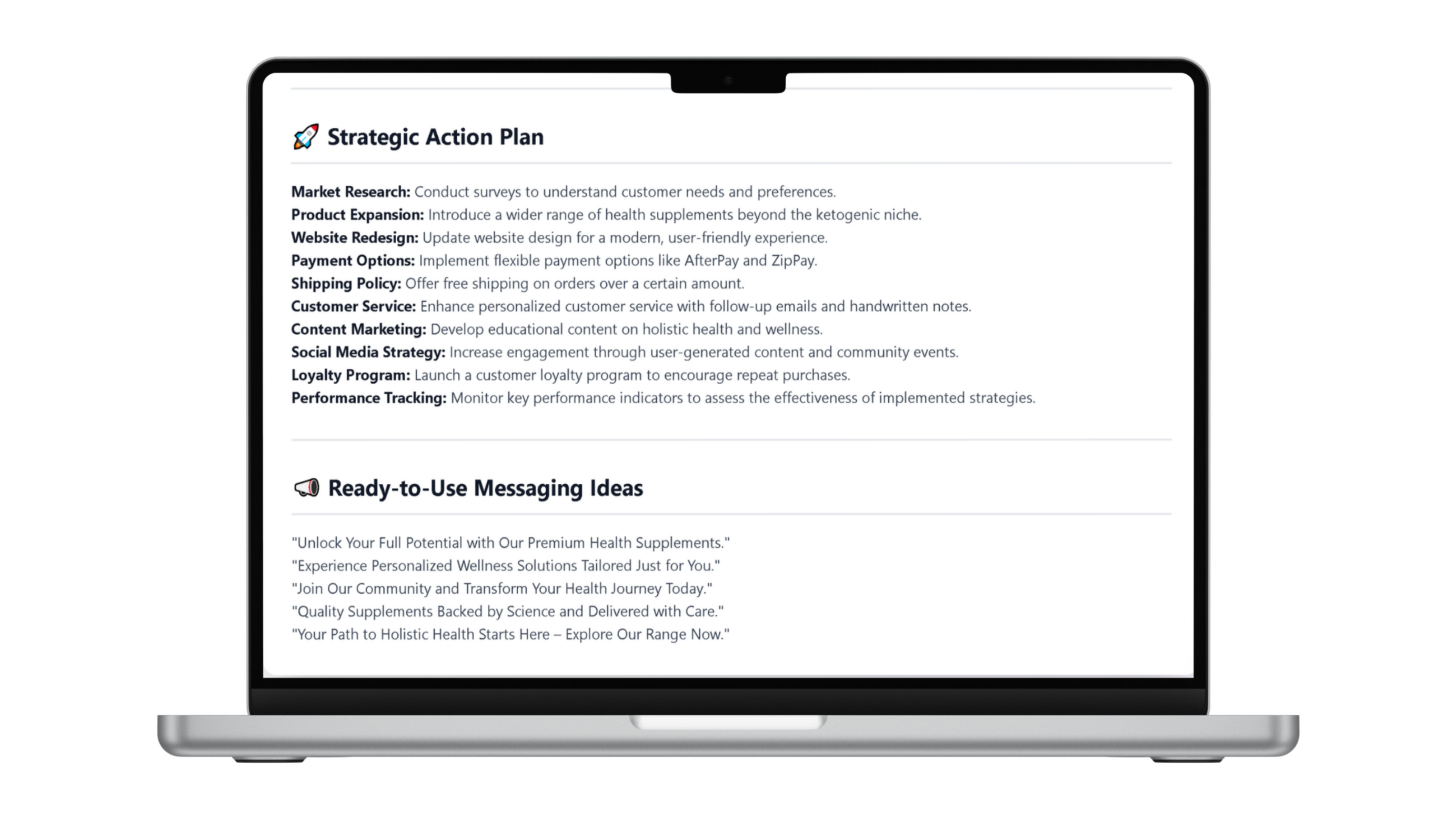 You get:✔ tailored marketing angles✔ niche-specific SEO✔ personalised recommendations✔ a unique launch path✔ product positioning✔ audience messaging✔ homepage advice✔ content ideasThis removes confusion instantly.