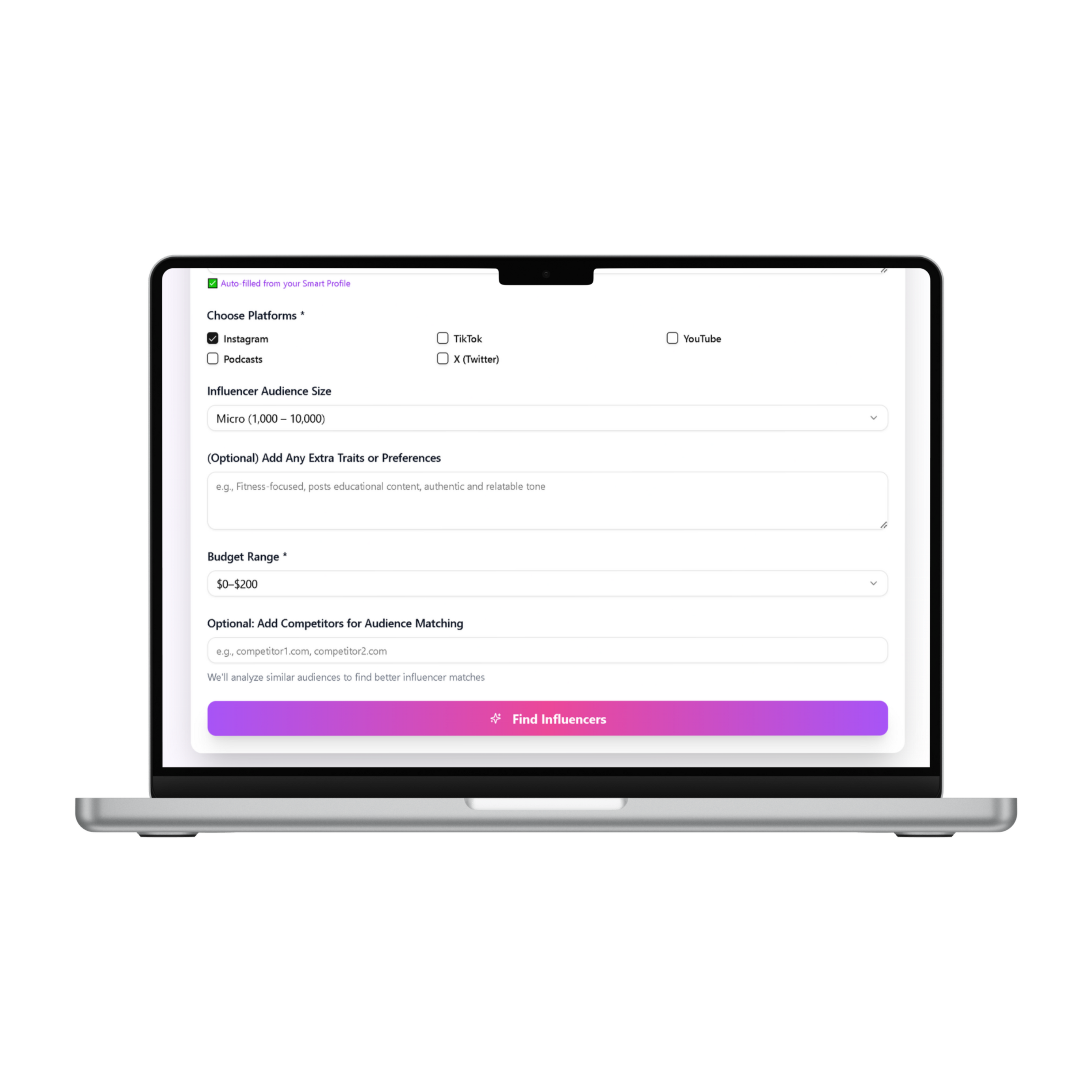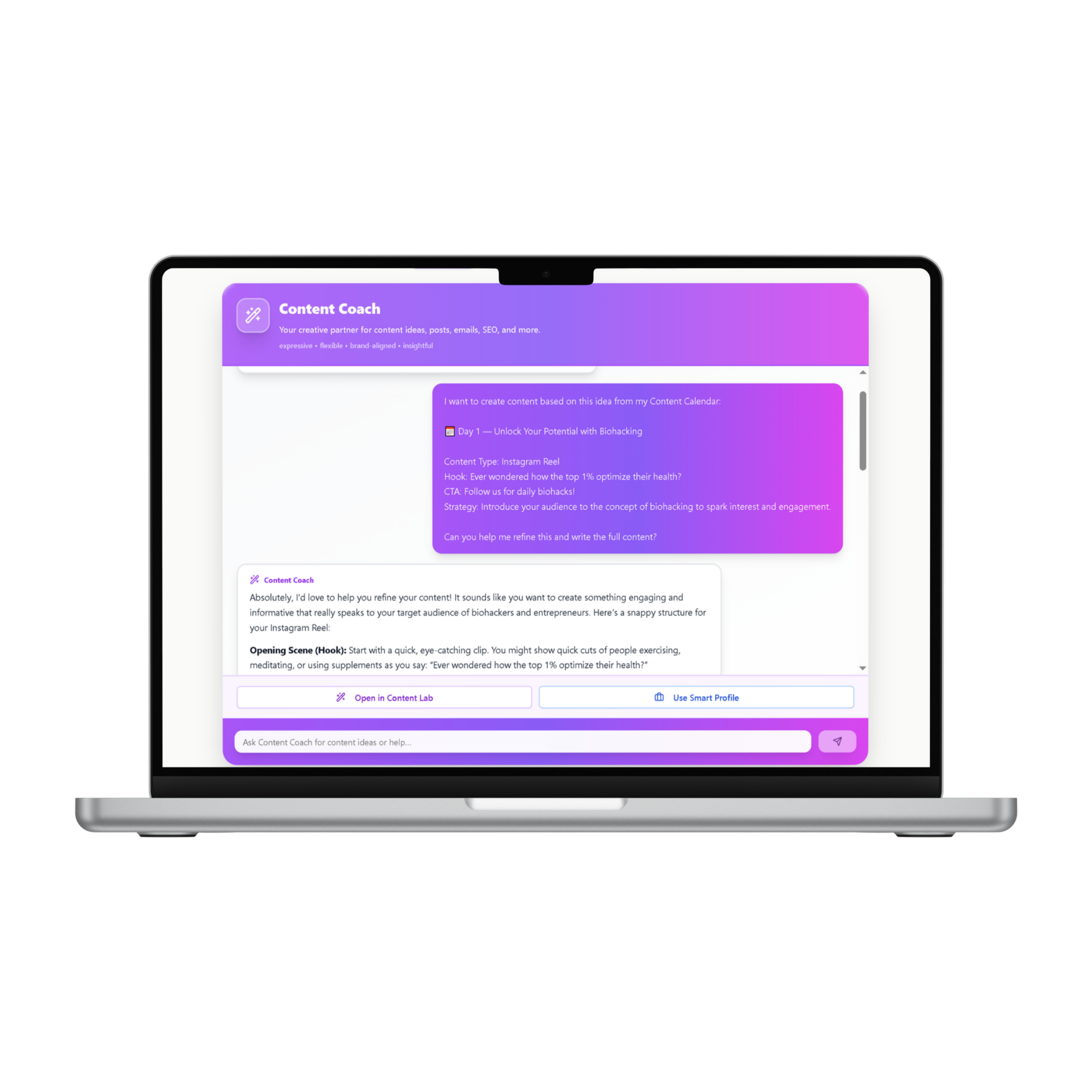 SmartProfile™ learns:- Your niche- Your audience- Your product- Your goals- Your challenges- Your brand personality