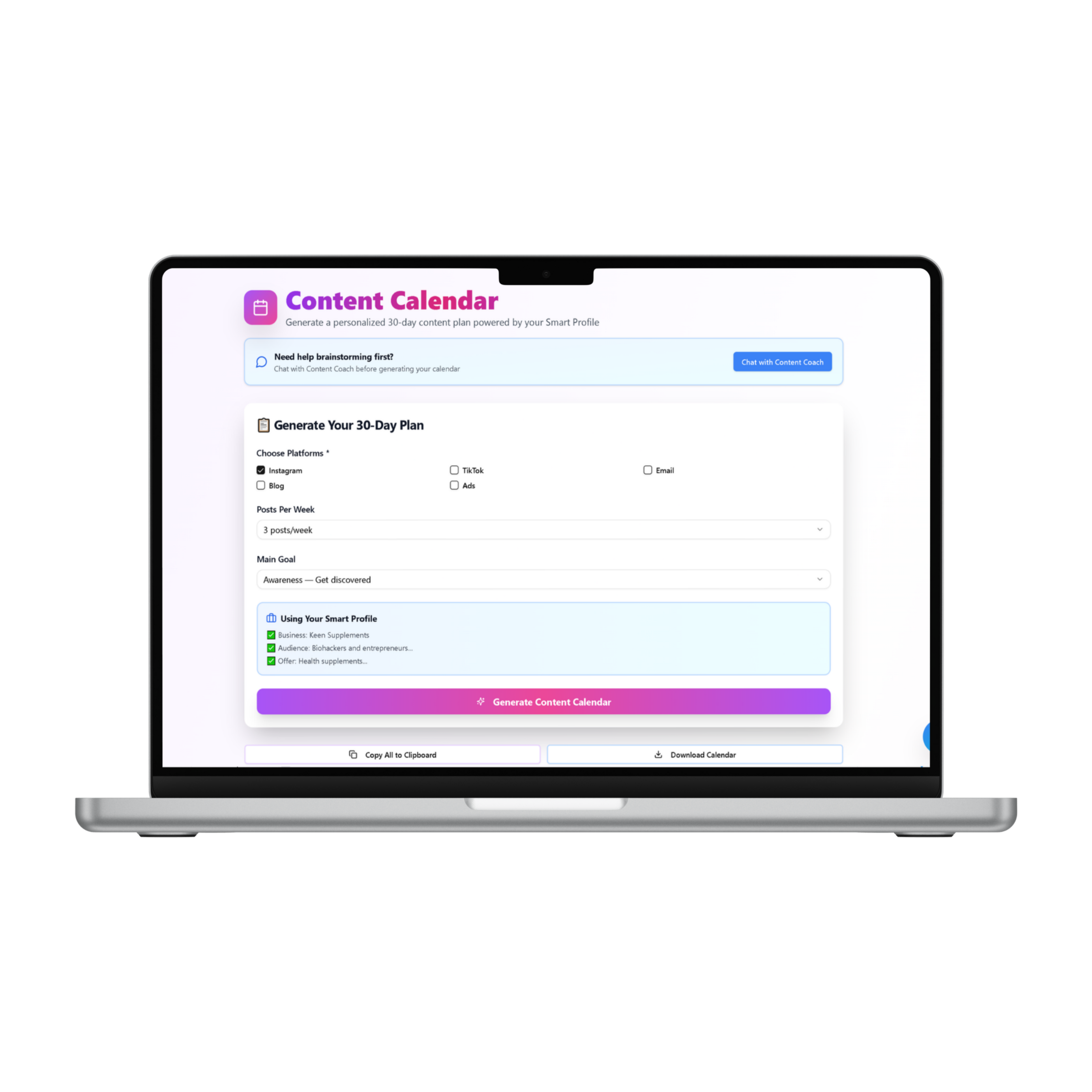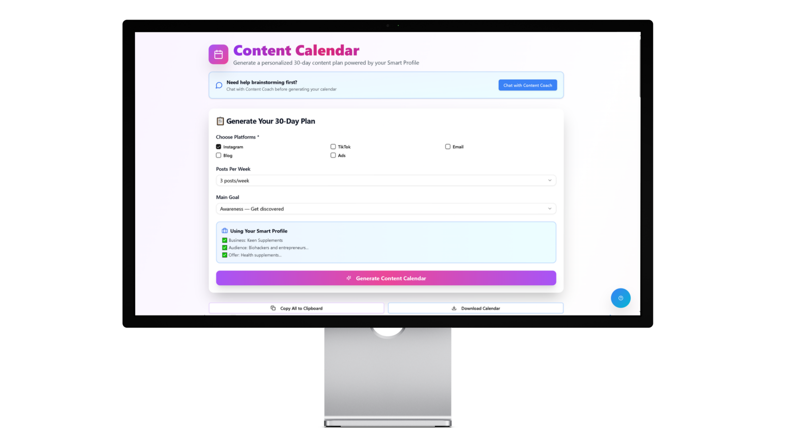 Pick your platform, posts per week and your calendar goal. Then simply click "Generate Content Calendar".