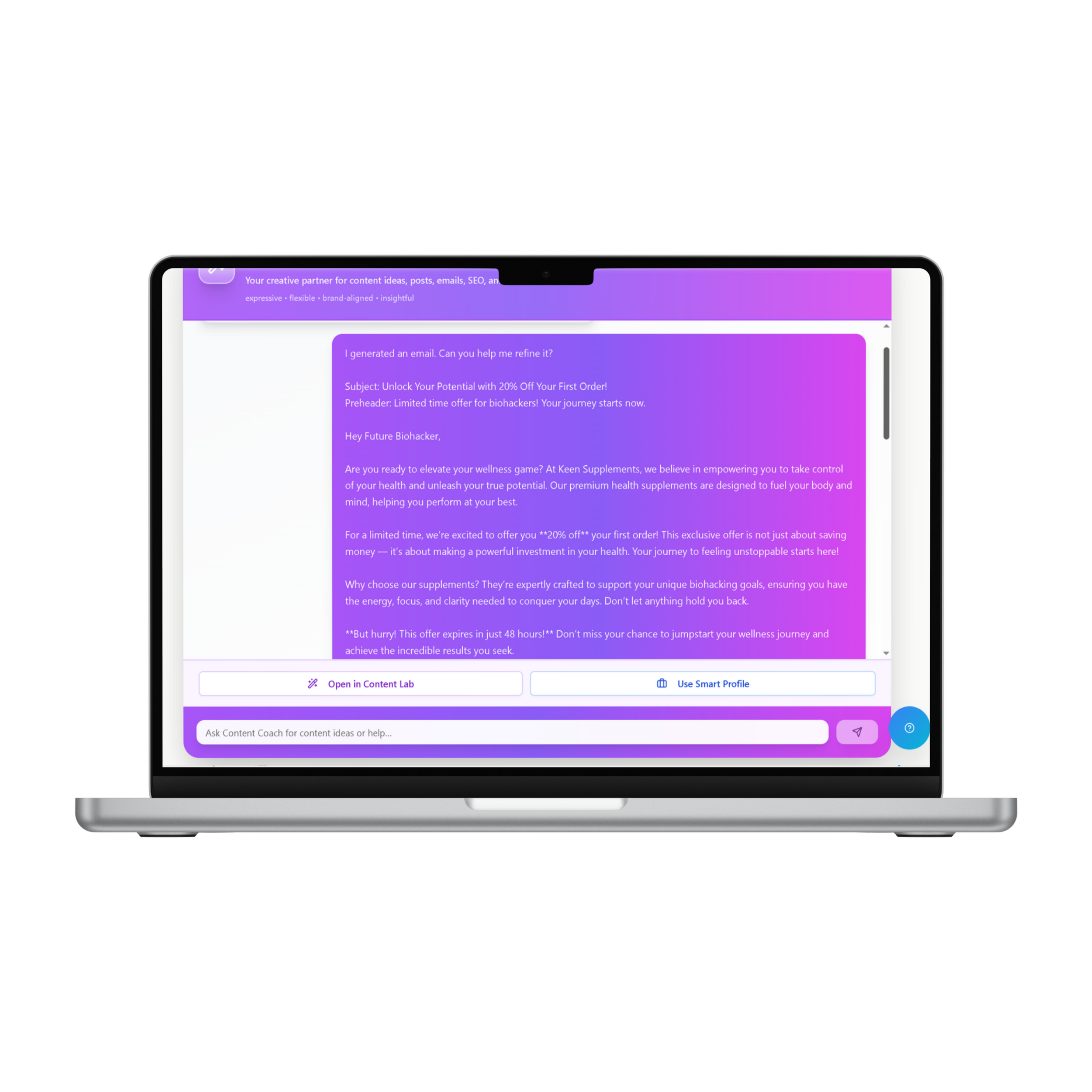 Email Marketing HQ will then use your Smart Profile™ data to generate a fully tailored email for your brand, audience and voice within seconds.Need to refine it more? No problem! At the click of a button you can send it to your Content Coach.